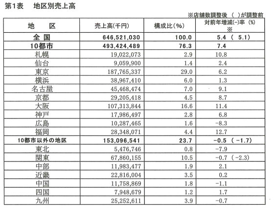 地区別では、インバウンド効果から好調を維持した9地区で前年実績をクリア。福岡、大阪、札幌は二桁増だった一方で、広島だけは8.3%減と4カ月連続でマイナスとなっている。4地区で前年割れとなった地方はマイナスに転じた。