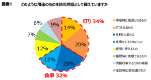 防災用品としてどのようなものを備えているのかたずねたところ、灯りと食事を確保するための物と回答した人が合計で6割超を占めた。