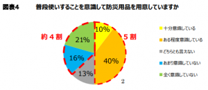 約半数の人が防災用品を日常でも使用したいと考える反面、約4割の人は意識せず防災用品を揃える条件として、普段使いできることを意識しているか聞いたところ、約4割の人は特に意識せずに揃えていると回答し、半数の人は普段使用することを意識して備えていることがわかった。普段から使用することを想定して防災用品として備えていれば、有事の際にも慌てることなく使用することができる。また、普段から使用していれば期限が切れていた、などということをも防ぐことができる。