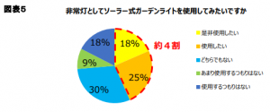 庭や玄関脇などに設置するソーラー充電式のガーデンライトは約6割の人が知らないと回答した一方で、約4割の人が使用したいと回答した。太陽光で充電できるので費用をかけずに庭をお洒落に彩ってくれるだけでなく、緊急時の非常灯の代替品として使用できる。