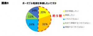 停電時に家族分のスマホなどを一週間程度充電したり、照明や家電製品の電源とすることができるポータブル電源について、半数以上の人が防災用品として準備したいと回答している。普段からキャンプなどのレジャーで使用できる防災用品として関心が高い。