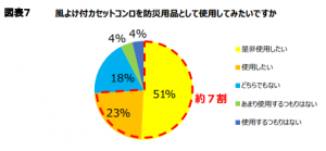 屋外で火力を保ちやすい風よけのついたカセットコンロを防災用品として約7割以上の人が使用してみたいと回答した。屋外でも温かい食事を摂るためにカセットコンロは被災時に有効であると認識している人が多いことがわかった。