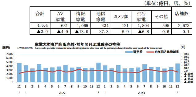 経済産業省の「商業動態統計速報」による家電大型専門店の12月の販売額は4654億円、前年同月比3.9%の減少となった。店舗数は2673店で前月から2店舗減っている。
