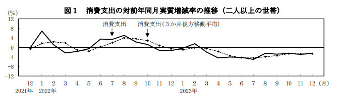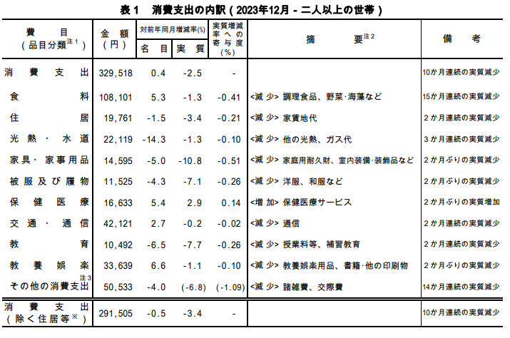 12月の消費支出は、2人以上の世帯で32万9518円で、前年同月比は物価変動の影響を除いた実質では2.5%の減少となった。名目では0.4%増加している。前月比(季節調整値)は実質0.9%減少した。