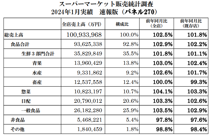 一般社団法人日本スーパーマーケット協会(JSA)、オール日本スーパーマーケット協会(AJS)、一般社団法人全国スーパーマーケット協会(NSAJ)の3団体による2024年1月の販売実績が発表された。集計はこの3団体会員企業のうちパネル270社(8380店舗)をまとめたものだ。