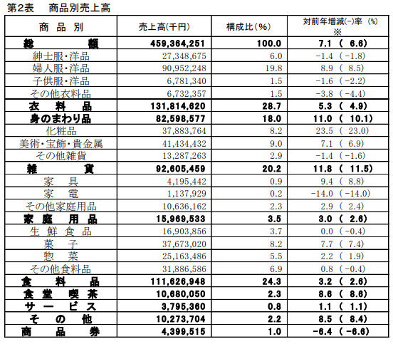 商品別では、主要5品目すべてで前年をクリアした。雑貨、美術・宝飾・貴金属、食料品、菓子はコロナ前の実績を超えた。とくに、ラグジュアリーブランドのバッグや時計、宝飾品など高額商材は、依然需要の強さに変化なく増勢が継続。化粧品はインバウンドの押し上げ効果などもあり高い伸びを示した。食料品は2カ月ぶりにプラスに転じた。