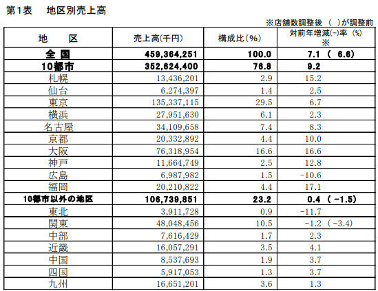 地区別では、インバウンド効果から好調を維持した9地区で前年実績を超えた。福岡、大阪、札幌、神戸、京都で二桁増となった。インバウンド需要が徐々に浸透してきた地方も2カ月ぶりにプラスに転じた。