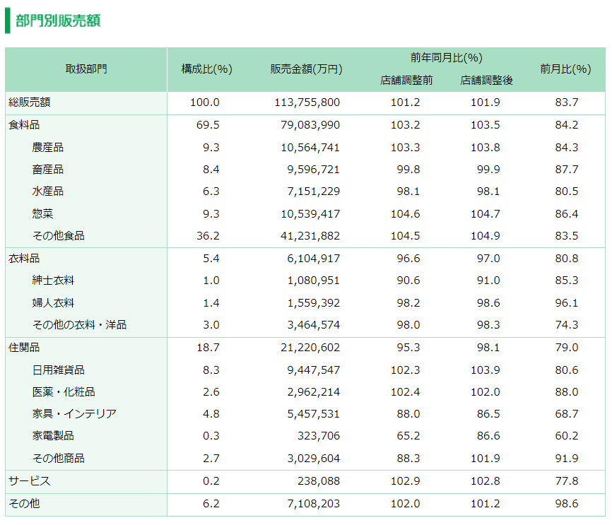 一方で「衣料品」は気温が高く推移したことから動きが鈍く、「住関品」も動きが鈍かった。「住関品」は構成比18.7%で、2122億0602万円。既存店前年同月比98.1%。「衣料品」は構成比5.6%で、610億4917万円。既存店前年同月比97.0%。
