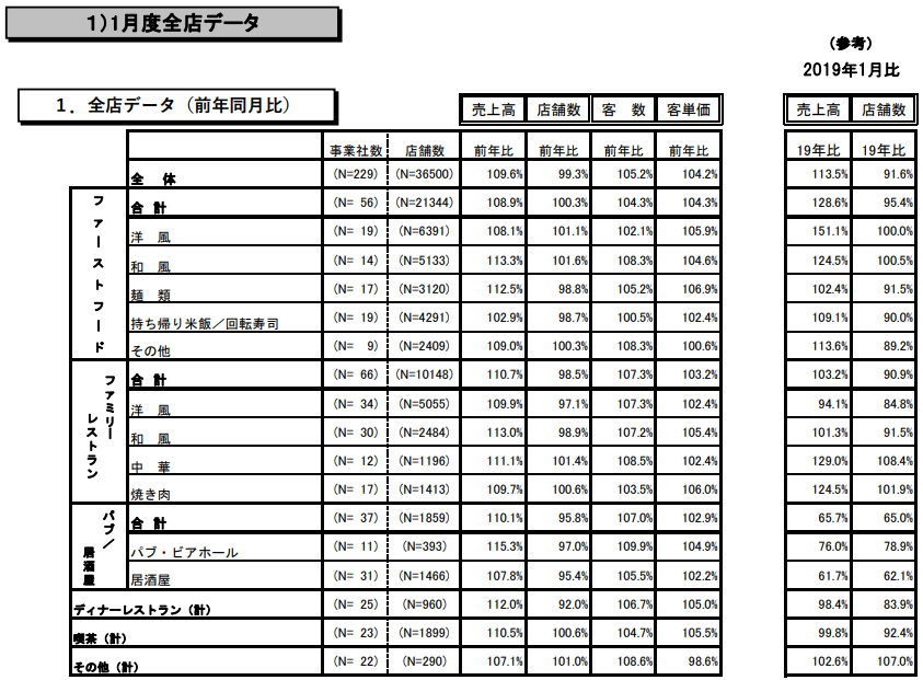 1月外食統計|全店売上高9.6%増/地震で一部自粛もインバウンド好調