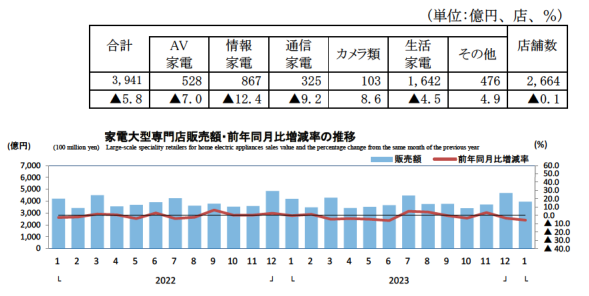 経済産業省の「商業動態統計速報」による家電大型専門店の2024年1月の販売額は3941億円、前年同月比5.8%減少した。店舗数は2664店で前年同月から0.1%減っている。