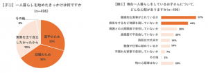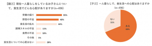 子どもに一人暮らしを始めたきっかけを聞くと、29%が「進学のため」、36%が「就職のため」と回答した。65%が環境の変化とともに一人暮らしを始めることが分かった(子①)。親に、子どもへの心配事があるかを聞くと、57%が「健康的な食事がとれているか」、44%が「病気をするなど体調を崩していないか」と回答し、健康面への心配に多くの回答が集まった(親①)。