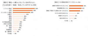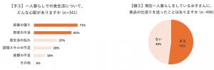 親に子どもの食生活に対する心配事を聞くと、55%が「栄養の偏り」、48%が「野菜の不足」と、栄養がしっかりととれているかという点に回答が集まった(親②)。子ども自身も69%が一人暮らしでの食生活に心配があると回答し(子②)、その具体的な心配事は71%が「栄養の偏り」、61%が「野菜の不足」で(子③)、親と子の心配事が全く同じことが分かった。