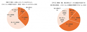 仕送りとして食品を送ったことがある親は全体の52%で(親③)、頻度は「数ヶ月に1回程度」という回答が最多の38%、月に1回以上の高頻度での送付は38%でだった(親④)。一方、仕送りを希望する子どもにその理想の頻度を聞くと、月に1回以上の高頻度での送付希望が65%となり(子④)、現実の仕送り頻度に対して理想の頻度の方が高いことが分かった。