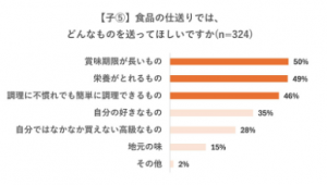 仕送りを希望する子どもに仕送りで送ってほしい食品を聞くと、半数近くが「賞味期限が長いもの」「栄養がとれるもの」「調理に不慣れでも簡単に調理できるもの」と回答した(子⑤)。一人暮らしの食生活への子どもの心配事で、「栄養の偏り」(71%) と「野菜の不足」(61%) に特に回答が集まった点も踏まえると(子③)、子どもにとっての理想の仕送りは、野菜などがたっぷり入っているなど栄養がたっぷりとれて、調理の手間や賞味期限の心配がない食品ということが分かった。