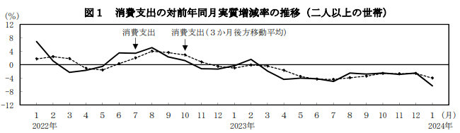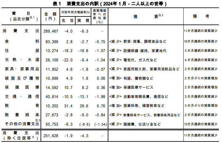 1月の消費支出は、2人以上の世帯で28万9467円で、前年同月比は物価変動の影響を除いた実質では6.3%の減少となった。名目では4.0%減少している。前月比(季節調整値)は実質2.1%減少した。
