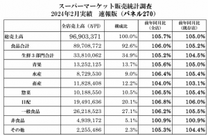 一般社団法人日本スーパーマーケット協会(JSA)、オール日本スーパーマーケット協会(AJS)、一般社団法人全国スーパーマーケット協会(NSAJ)の3団体による2024年2月の販売実績が発表された。集計はこの3団体会員企業のうちパネル270社(8378店舗)をまとめたものだ。
