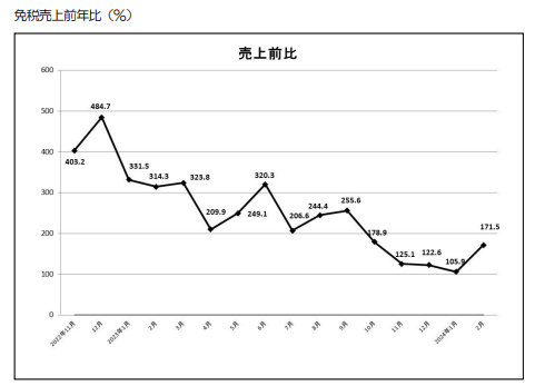 2月の免税総売上高は約469億9000万円で、前年同月比は171.5%増。売上高の内訳は「一般物品」が約410億8000万円で168.1%増、「消耗品」が約59億1000万円で197.6%増だった。