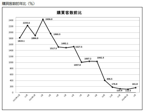 購買客数は約41万9000人で161.8%増。一人当たり購買単価は約11万円で前年同月よりプラス3.7%となった。