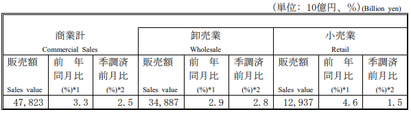 具体的には商業販売額の動向として、卸売業販売額と小売業販売額の動向、そして業態別の販売額の動向として百貨店・スーパー販売額、コンビニエンスストア、家電大型専門店、ドラッグストア、ホームセンターの統計数値が発表される。