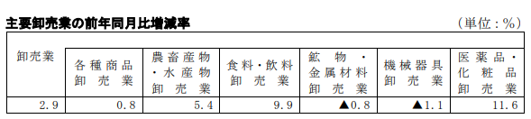 卸売業を業種別にみると、前年クリアしたのは医薬品・化粧品卸売業の11.6%増、衣服・身の回り品卸売業の10.7%増、食料・飲料卸売業の9.9%増、家具・建具・じゅう器卸売業の6.5%増加、農畜産物・水産物卸売業の5.4%増、化学製品卸売業の5.2%増、建築材料卸売業の1.6%増加、繊維品卸売業の1.0%増、各種商品卸売業の0.8%増。その他の卸売業は0.0%の横ばいとなった。一方、機械器具卸売業が1.1%減、鉱物・金属材料卸売業が0.8%減と前年を割った。