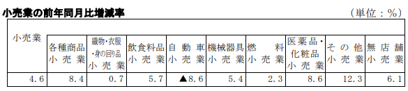 小売業を業種別にみると、最も伸長したのがその他小売業で、12.3%増。次に医薬品・化粧品小売業8.6%増、各種商品小売業(百貨店など)が8.4%増、無店舗小売業が6.1%増、飲食料品小売業が5.7%増、機械器具小売業が5.4%増、燃料小売業が2.3%増、織物・衣服・身の回り品小売業が0.7%増と続く。一方で自動車小売業のみ、8.6%の減少となった。