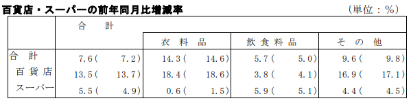 百貨店の動向として、主力商品である衣料品は、身の回り品が24.5%増、婦人・子供服・洋品が17.9%増と2ケタ増。紳士服・洋品が6.6%増、その他の衣料品が0.1%増となったため、衣料品全体では18.4%増加した。飲食料品は同3.8%の増加となった。