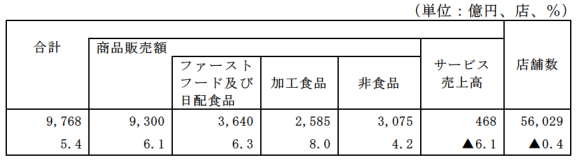 商品別にみるとファーストフードと日配食品が3640億円で6.3%増、加工食品が2585億円で8.0%増、非食品が3075億円で4.2%増。売上げの内訳は、商品販売額が9300億円(6.1%増)、サービス売上高が468億円(6.1%減)だった。