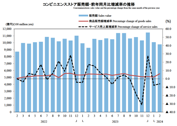 コンビニエンスストアの2月の商品販売額およびサービス売上高は9768億円で、5.4%増加した。