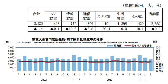 経済産業省の「商業動態統計速報」による家電大型専門店の2024年2月の販売額は3423億円、前年同月比1.4%減少した。店舗数は2662店で前年同月から0.3%減っている。