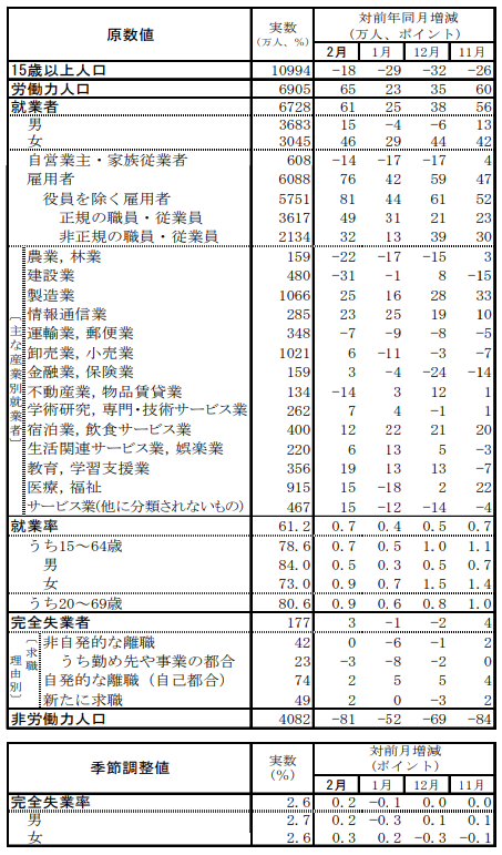 2月労働力調査|就業者数6728万人/卸売業・小売業の就業者前年比6万人増
