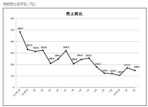 3月の免税総売上高は約495億4000万円で、前年同月比は148.4%増。売上高の内訳は「一般物品」が約427億3000万円で144.0%増、「消耗品」が約68億1000万円で179.4%増だった。