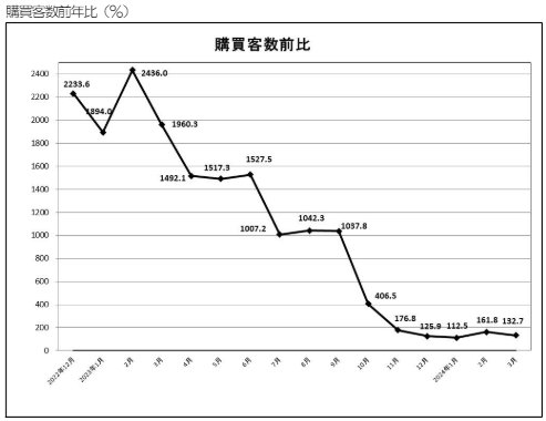 購買客数は約45万4000人で132.7%増。一人当たり購買単価は約10万8000円で前年同月よりプラス6.7%となった。