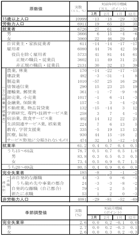 3月労働力調査|就業者数6726万人/卸売業・小売業の就業者前年比1万人減