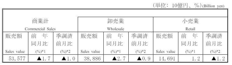 経済産業省大臣官房調査統計グループが毎月の商業動態統計速報を発表する。「商業」とは「小売業」と「卸売業」の総称であり、小売業・卸売業を営む企業と事業所・店舗の事業活動に関する動向を把握することを目的に調査される。