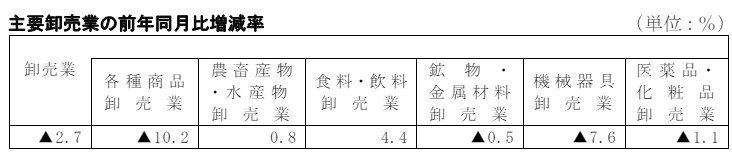 卸売業を業種別にみると、各種商品卸売業が10.2%減、機械器具卸売業が7.6%減、建築材料卸売業が6.3%減、繊維品卸売業が4.3%減、その他の卸売業が4.3%減、衣服・身の回り品卸売業が1.1%減、医薬品・化粧品卸売業が1.1%減、鉱物・金属材料卸売業が0.5%減と軒並みマイナス。一方でプラスだったのは、食料・飲料卸売業が4.4%増、化学製品卸売業が1.2%増、家具・建具・じゅう器卸売業が1.2%増、農畜産物・水産物卸売業が0.8%増だった。