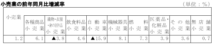 小売業を業種別にみると、機械器具小売業が8.1%増、燃料小売業が7.3%増、各種商品小売業(百貨店など)が6.1%増、飲食料品小売業が4.6%増、医薬品・化粧品小売業が3.9%増、その他小売業が3.6%増、無店舗小売業が0.7%増だった。一方、自動車小売業が15.9%の2ケタ減、織物・衣服・身の回り品小売業が3.8%減となった。