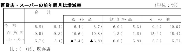 スーパーの動向として、主力商品である飲食料品は6.6%の増加となった。衣料品は婦人・子供服・洋品が9.1%減、紳士服・洋品が8.6%減、身の回り品が3.5%減、その他の衣料品が1.4%減で、衣料品全体では7.4%の減少となった。