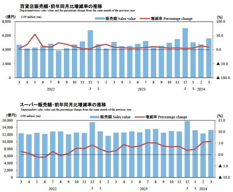 2024年3月の百貨店・スーパー販売額の動向を見る。百貨店・スーパー販売額は1兆8876億円、前年同月比でみると、6.8%の増加となった。百貨店は5605億円、9.5%増、スーパーは1兆3271億円、5.7%増。商品別にみると、衣料品は6.4%増、飲食料品は6.0%増、その他は9.9%増だった。なお、百貨店・スーパーの季節調整済前月比は1.0%の低下。百貨店は3.8%低下したが、スーパー0.5%上昇した。