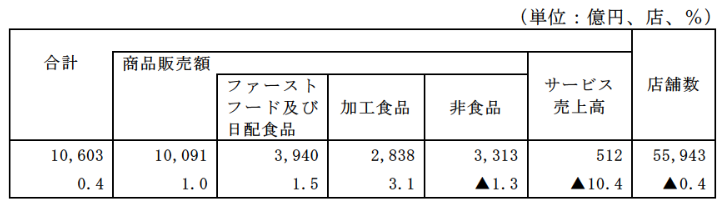 商品別にみるとファーストフードと日配食品が3940億円で1.5%増、加工食品が2838億円で3.1%増、非食品が3313億円で1.3%減。売上げの内訳は、商品販売額が1兆0091億円で1.0%増、サービス売上高が512億円で10.4%減少した。