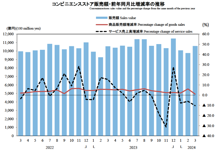 コンビニエンスストアの3月の商品販売額およびサービス売上高は1兆0603億円で、0.4%増加した。