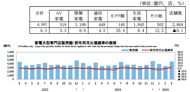 経済産業省の「商業動態統計速報」による家電大型専門店の2024年3月の販売額は4563億円、前年同月比6.3%増加した。店舗数は2664店で前年同月から0.1%減っている。