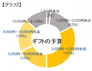 「父の日」のギフトの予算はいくらかについてたずねたところ、「3000円~5000円未満(32%)」が最も多く、次に「8000円~1万円未満(19%)」と「5000円~8000円未満(18%)」がほぼ同率だった。5000円を境にして二極化していることがわかった。