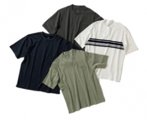 ジャケットの皮脂汚れを軽減させる「スロープネック」仕様のTシャツ。ハリ感のある素材はきちんと感があり、ジャケットとのコーディネートにも最適で、ビジネスからカジュアルまで活躍する一着。サイズはS~3L、色は白・グレー・Lグレー・黒・紺・ミント・カーキ、価格は3289円・4389円(税込み、以下同じ)。