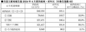 日本生活協同組合連合会(東京都渋谷区、土屋敏夫代表理事会長)が、2024年4月度の供給状況(売上高)を発表した。65生協を対象としている。
