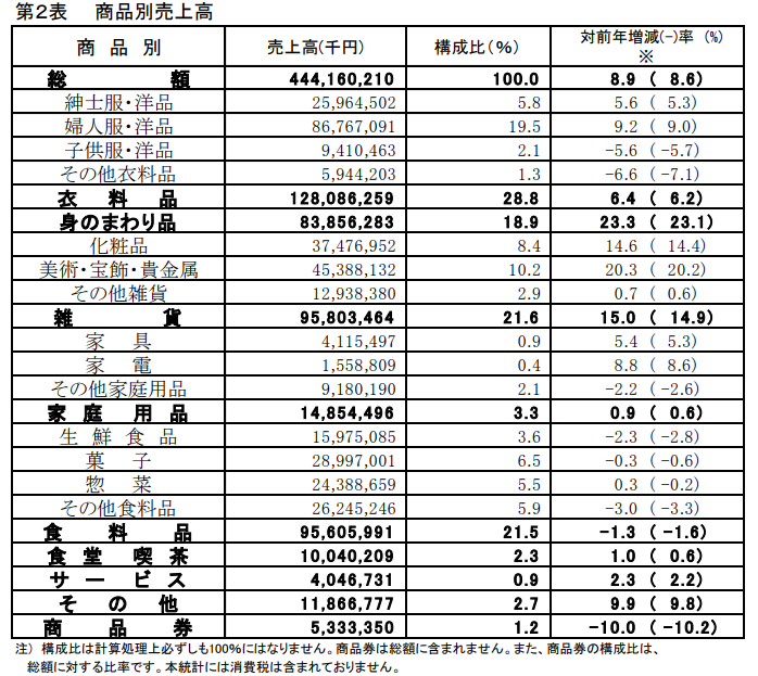 商品別では、主要5品目のうち4品目で前年をクリアした。この内、身のまわり品と雑貨は二桁増で、2019年比でも増収。ラグジュアリーブランドのバッグや時計、宝飾など高額商材や化粧品は引き続き国内外ともに好調だった。主力の衣料品は、天候要因により、ジャケットやカーディガン、カットソーなどが動いた。食料品は、生鮮食料品の価格上昇の影響などから前年実績を割ったが、弁当や惣菜は、花見需要もあり堅調に推移した。
