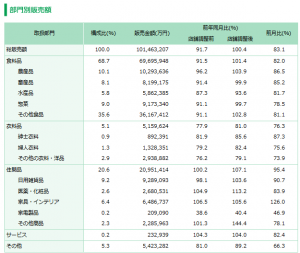 「衣料品」は、気温の低下により春物商品の動きが鈍かった。構成比は5.1%で、売上高515億9624万円、既存店81.0%で前年割れとなった。