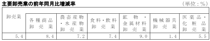 卸売業を業種別にみていく。繊維品卸売業が前年同月比9.0%増、鉱物・金属材料卸売業が9.0%増、各種商品卸売業が8.4%増、食料・飲料卸売業が7.4%増、農畜産物・水産物卸売業が7.2%増、医薬品・化粧品卸売業が5.5%増、衣服・身の回り品卸売業が5.4%増、化学製品卸売業が5.3%増、その他の卸売業が3.8%増、建築材料卸売業が3.0%増、家具・建具・じゅう器卸売業が2.6%増、機械器具卸売業が1.4%増と、全業種でプラスとなった。
