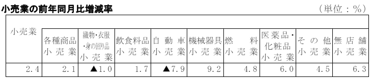 小売業を業種別にみると、機械器具小売業が9.2%増、無店舗小売業が6.3%増、医薬品・化粧品小売業が6.0%増、燃料小売業が4.8%増、その他小売業が4.5%増、各種商品小売業(百貨店など)が2.1%増、飲食料品小売業が1.7%増となった。一方、自動車小売業が7.9%減、織物・衣服・身の回り品小売業が1.0%減となった。