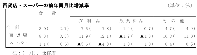 また既存店前年同月比は、百貨店・スーパーが2.7%増、百貨店は8.5%増、スーパーは0.6%増となった。