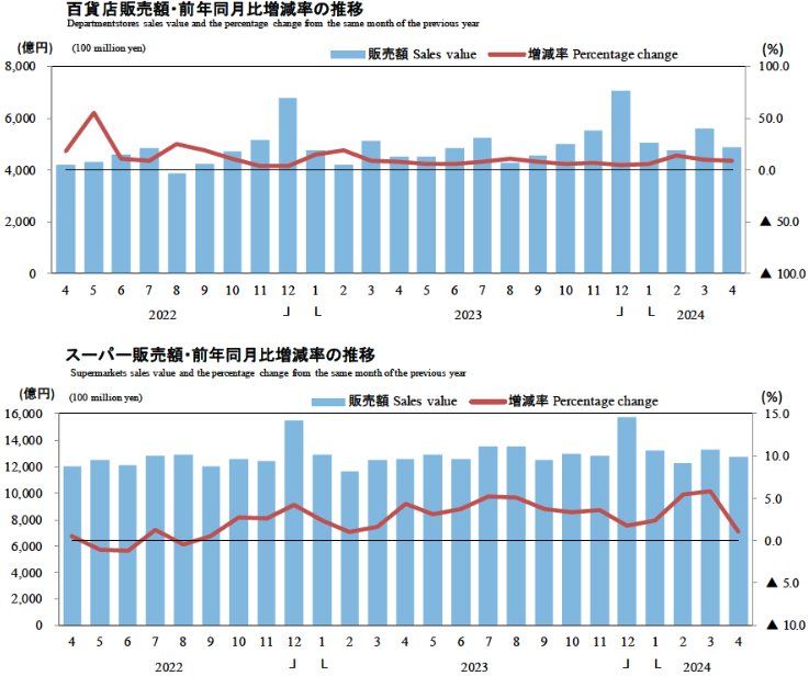 次は2024年4月の百貨店・スーパー販売額の動向を見る。百貨店・スーパー販売額は1兆7612億円、3.0%の増加となった。百貨店は4870億円で8.3%増、スーパーは1兆2742億円で1.1%
